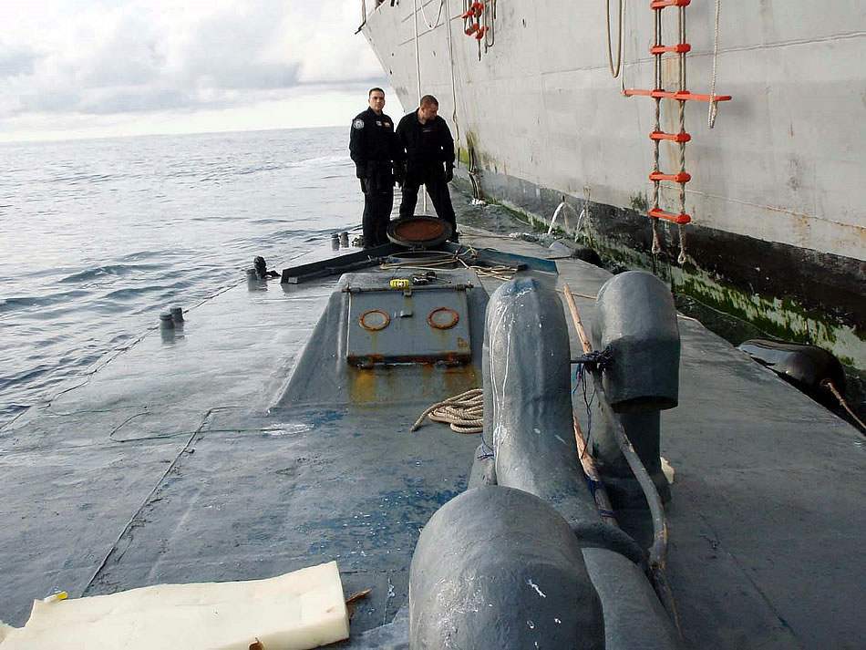 ATLANTIC OCEAN (Sept. 13, 2008) In this photo released by the U.S. Coast Guard, members of U.S. Coast Guard law enforcement detachment 404 survey the deck of the self-propelled, semi-submersible craft seized Saturday, Sept. 13, 2008, by the guided-missile frigate USS McInerney (FFG 8). The Coast Guard law enforcement officers, embarked aboard the McInerney, seized the estimated $187 million worth of cocaine during a night raid about 350 miles west of Guatemala. The seized vessel has the capability to travel from Ecuador to San Diego, Calif. U.S. Navy photo by Petty Officer 1st Class Nico Figueroa