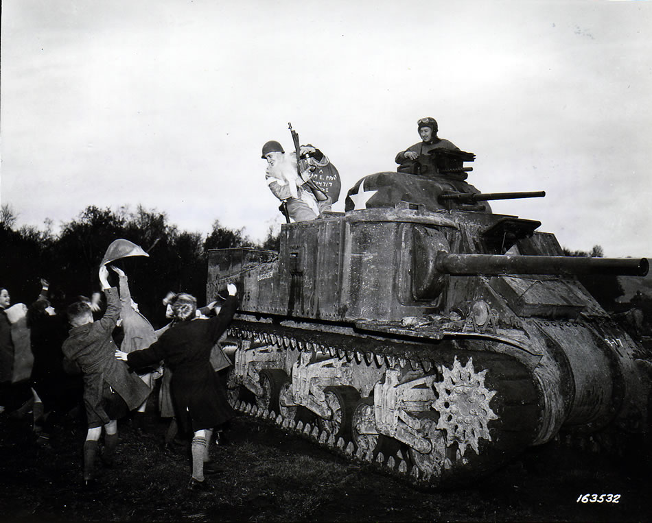 A 1942 Santa arriving by tank instead of outdated sleigh. Sgt. Hiram Prouty playing Santa for British children. Dec 5, 1942. Perham Downs, England. M.3. Tank of 1st Tank Group. Sgt. Prouty, member of 175th Inf.