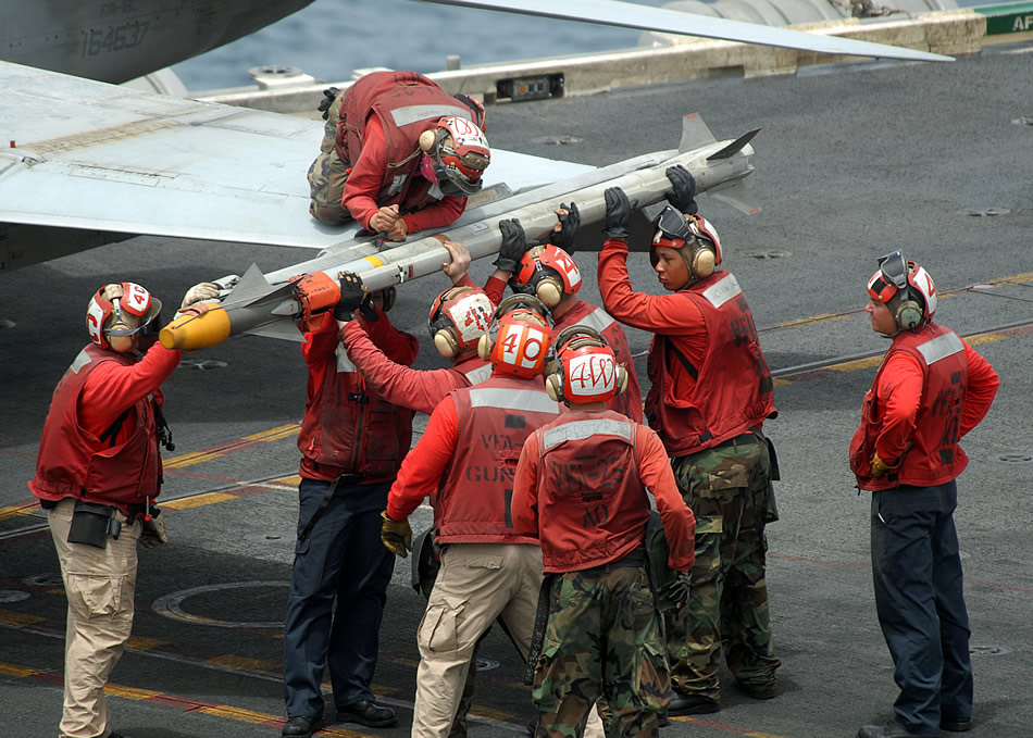 A group of Aviation Ordnancemen, assigned to Strike Fighter Squadron 25, detach a missile from the wing of an F/A-18C Hornet on the flight deck of the aircraft carrier USS Ronald Reagan. Aviation ordnancemen are responsible for maintaining, repairing, installing, operating and handling aviation ordnance equipment. Photo by Oliver Cole