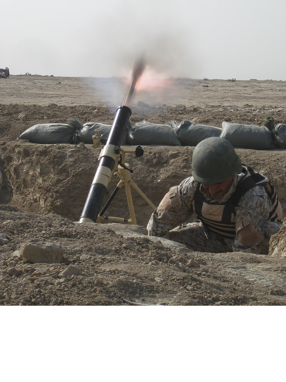 An Iraqi mortarman takes cover after launching his first 81mm round at a live fire exercise near Nasiriyah, Iraq, Aug. 24. The soldier from 1st Battalion, 40th Iraqi Army Brigade fired the round to culminate weeks of intense mortar skills training. The mortars provide indirect fire capability for Iraqi infantry assigned to 1st Battalion, 40th Iraqi Army Brigade. The 40th IA brigade is partnered with the 1st Battalion, 77th Armor Regiment "Steel Tigers" deployed from Fort Bliss, Texas. Photo by Maj. Myles Caggins