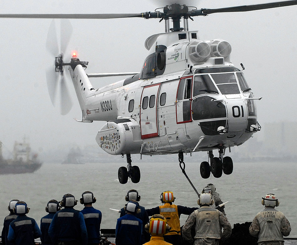 Sailors and Marines aboard the amphibious dock landing ship USS Harpers Ferry conduct a vertical replenishment with an SA-330 Puma helicopter assigned to the combat stores ship USNS San Jose. Harpers Ferry, the amphibious dock landing ship USS Tortuga and the 31st Marine Expeditionary Unit are supporting humanitarian efforts at the request of the Republic of the Philippines after two major storms struck the region. Photo by Petty Officer 2nd Class Joshua Wahl