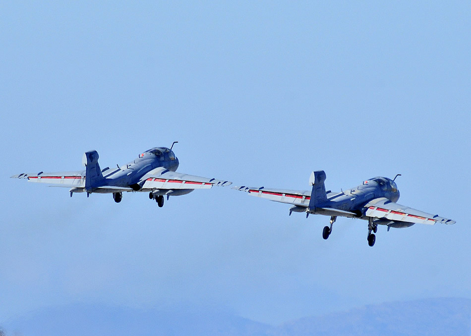 A pair of EA-6B Prowlers, assigned to Marine Tactical Electronic Warfare Squadron 3, take off following a transient stopover. The Moon Dogs of VMAQ 3 are based at Marine Corps Air Station Cherry Point, North Carolina with a mission of supporting the Marine Air-Ground Task Force commander by conducting airborne electronic warfare, day or night, under all weather conditions, during expeditionary, joint, or combined operations. Photo by Paul Farley