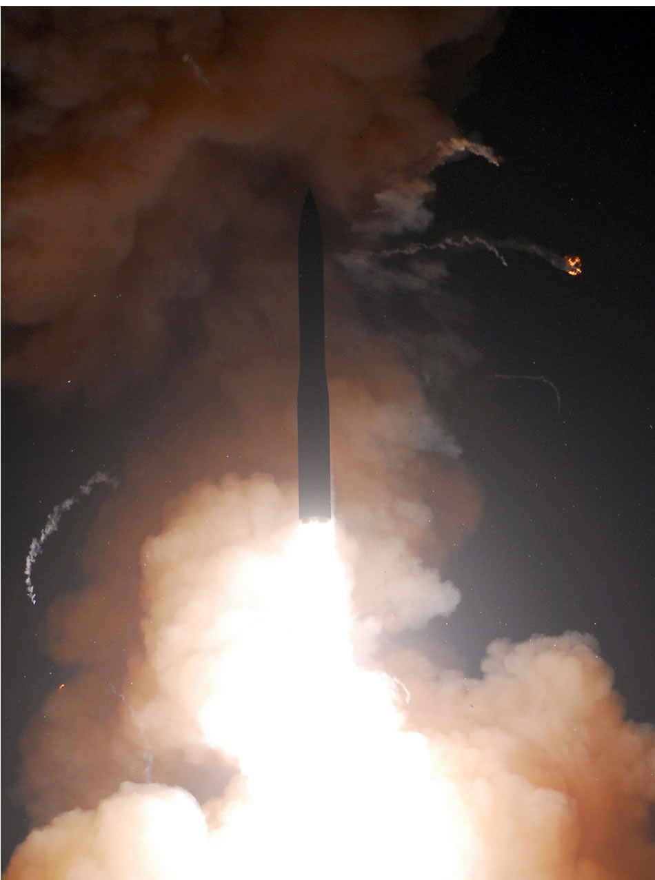 A Minuteman III intercontinental ballistic missile launches June 16, 2010, from Vandenberg Air Force Base, Calif. The missile's single re-entry test vehicle traveled approximately 4,190 miles before hitting its pre-determined target near the Kwajalein Atoll in the Marshall Islands. (U.S. Air Force photo/Joe Davila)