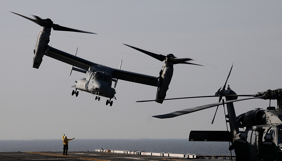 ATLANTIC OCEAN (Oct. 18, 2010) An MV-22B Osprey assigned to Marine Medium Tiltrotor Squadron (VMM) 263 takes off from the multipurpose amphibious assault ship USS Bataan (LHD 5). Bataan is underway conducting landing qualifications. (U.S. Navy photo by Mass Communication Specialist 2nd Class Julio Rivera)