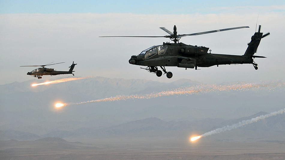 Two AH-64D Apache Longbows from Task Force Comanche, 4th Combat Aviation Brigade, 4th Infantry Division, flying side-by-side launch flares during a mission near Shindand Air Base. The AH-64D Apache is responsible for most of the air weapons team coverage in Afghanistan, such as the coverage of an emergency air extraction mission Oct. 2, 2010 that resulted in four Apache pilots and one task force commander receiving the Distinguished Flying Cross March 22, 2011 in recognition of their heroism, valor and lack of hesitation.
