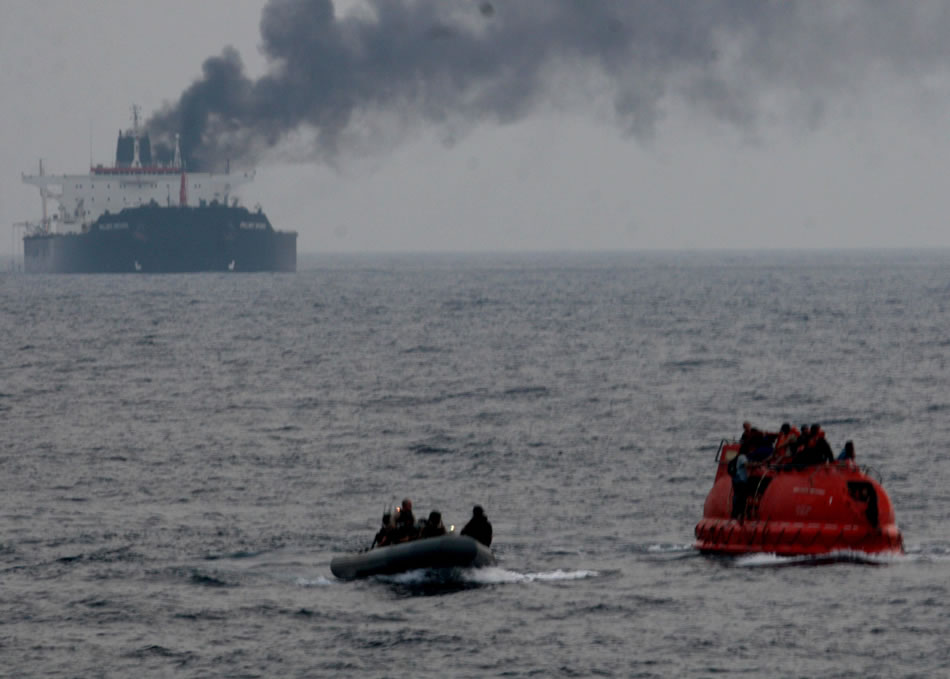 GULF OF ADEN (July 6, 2011) Sailors assigned to the guided-missle cruiser USS Philippine Sea (CG 58) approach a life boat to rescue crew members from the Liberian-flagged motor vessel MT Brilliante Virtuoso. The crew of Brilliante Virturoso abandoned ship due to a fire aboard the vessel. (U.S. Navy photo by Chief Intelligence Specialist Raynald Lenieux)