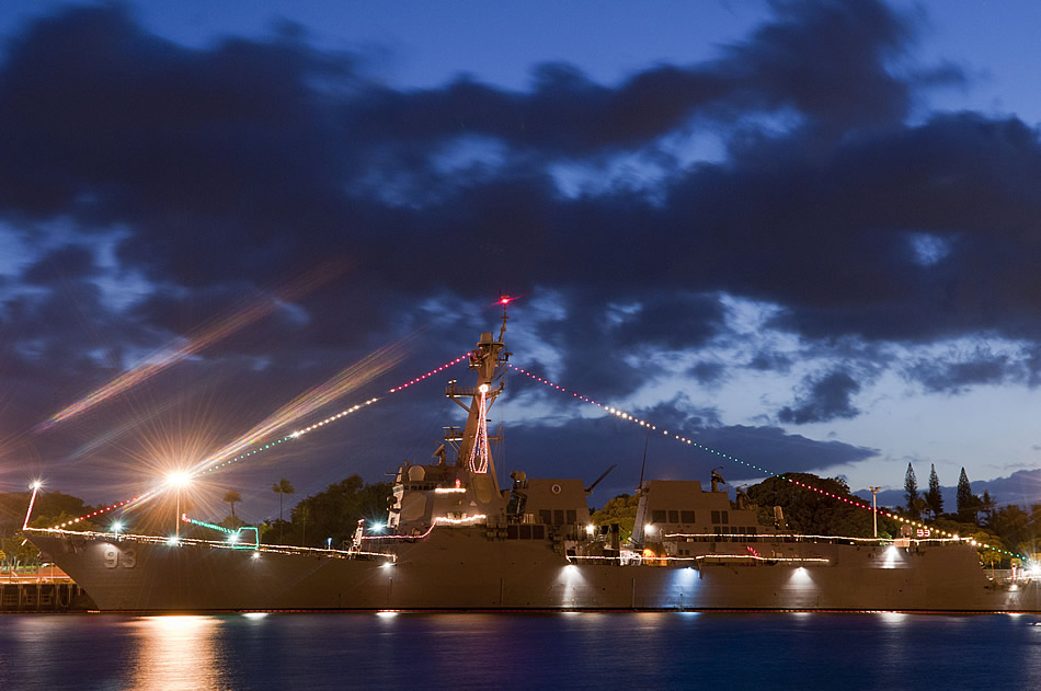 JOINT BASE PEARL HARBOR-HICKAM (Dec. 21, 2011) The guided-missile destroyer USS Chung-Hoon (DDG 93) is decorated with Christmas lights at Joint Base Pearl Harbor-Hickam. (U.S. Navy photo by Mass Communication Specialist 2nd Class Mark Logico)