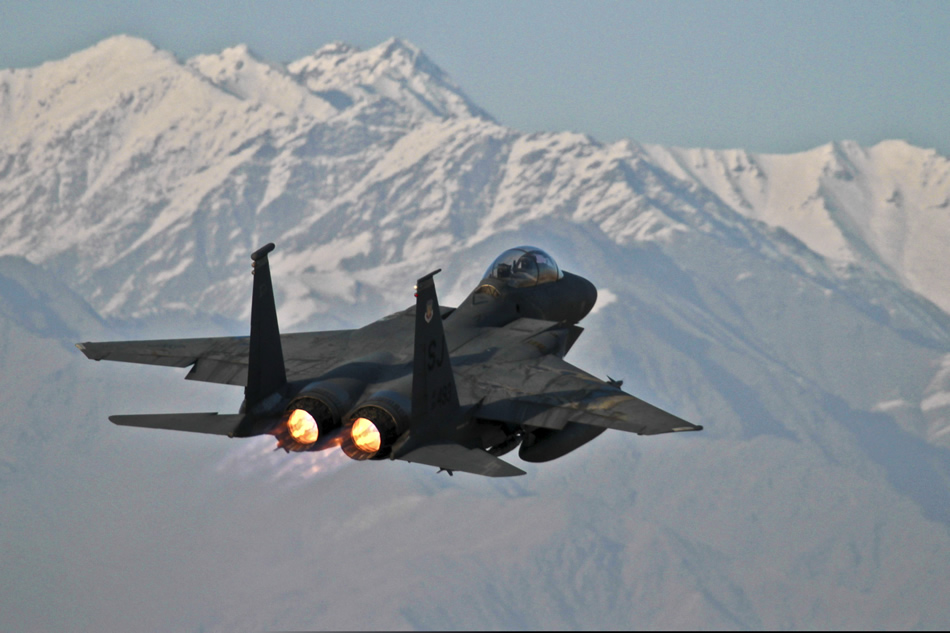 A U.S. Air Force F-15E Strike Eagle takes off from Bagram Air Field, Afghanistan, Dec. 21, 2011. U.S. Air Force photo by Tech. Sgt. Matt Hecht
