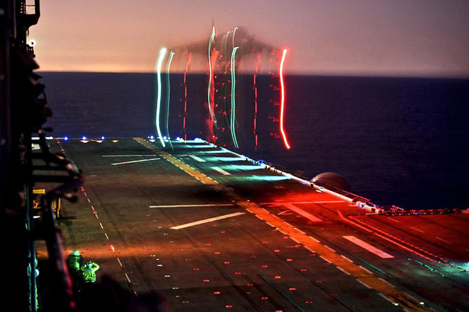 PACIFIC OCEAN (Nov. 7, 2011) A Marine Corps Harrier AV-8B II conducts nighttime launch and recovery operations aboard USS Bonhomme Richard (LHD 6). (U.S. Navy photo by Senior Chief Mass Communication Specialist Joe Kane)