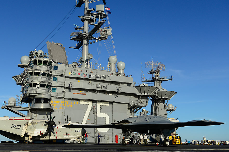 ATLANTIC OCEAN (Dec. 9, 2012)The X-47B Unmanned Combat Air System (UCAS) demonstrator taxies on the flight deck of the aircraft carrier USS Harry S. Truman (CVN 75). Harry S. Truman is the first aircraft carrier to host test operations for an unmanned aircraft. Harry S. Truman is underway supporting carrier qualifications. U.S. Navy photo courtesy of Northrop Grumman Corp. by Alan Radecki