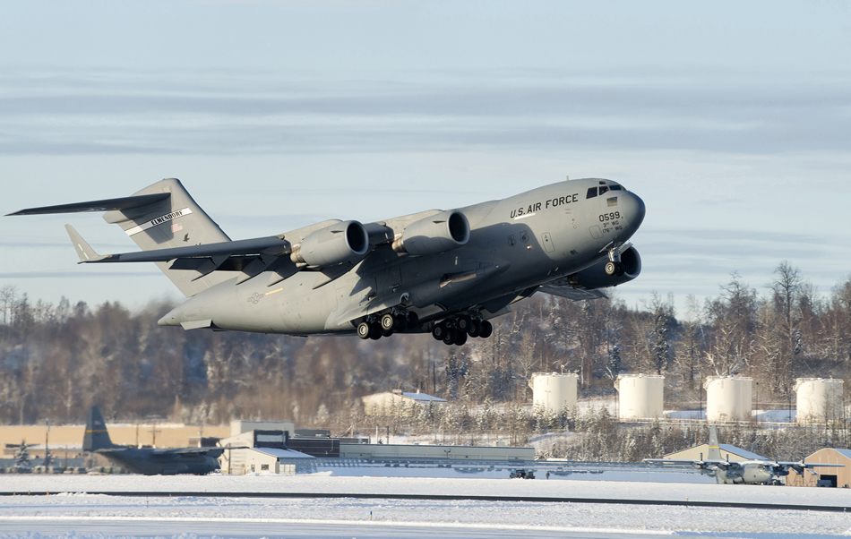A C-17 Globemaster III from the 517th Airlift Squadron, takes off from Joint Base Elmendorf-Richardson Nov. 11, 2013. The C-17 was requested to support Operation Damayan to supply aid to the areas affected by Typhoon Haiyan. They will be able to provide transport of supplies, personnel, or evacuees, depending on what the mission requires. (U.S. Air Force photo/Staff Sgt. Zachary Wolf)