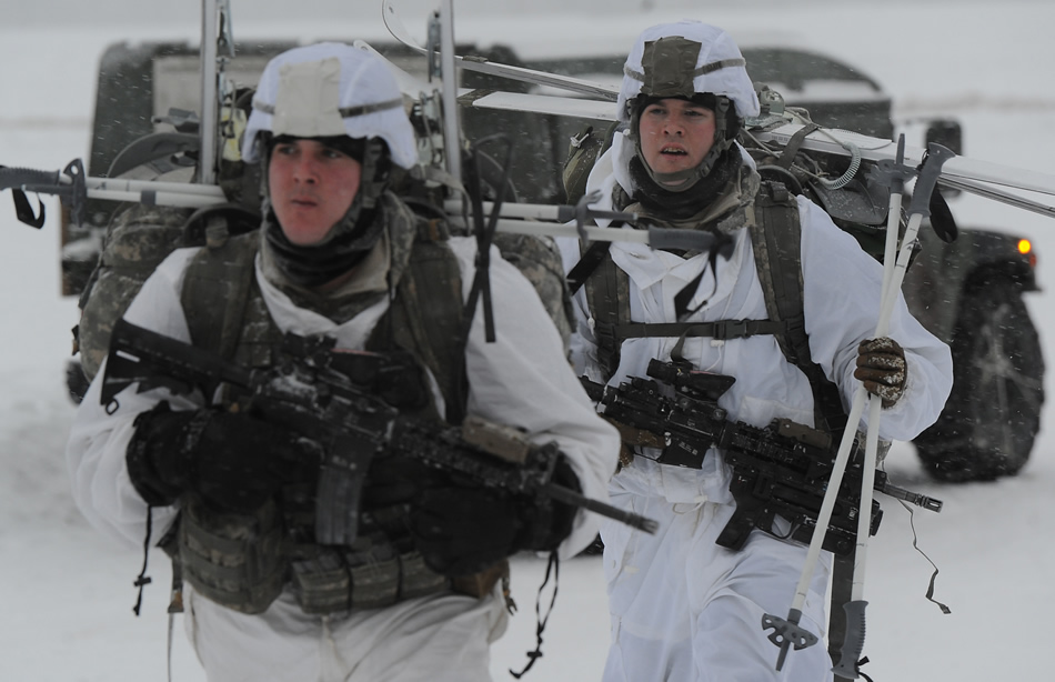 Army Sgt. Matthew Berg, a native of Prior Lake, Minn., left, and Spc. William Baker, a native of Midlothian, Va., both assigned the C Troop 1st Squadron (Airborne), 40th Cavalry Regiment, 4th Infantry Brigade Combat Team (Airborne), 25th Infantry Division, part of U.S. Army Alaska, march to a rally point after conducting an Arctic airborne operation in the complete over-white uniform on Malemute drop zone at Joint Base Elmendorf-Richardson, Alaska, Dec. 12, 2013. This is the first Arctic airborne operation for the brigade since its redeployment from Afghanistan last year, and the purpose of this training event is to further validate the unit's rapid insertion capability into Arctic conditions. (U.S. Air Force photo by Justin Connaher)