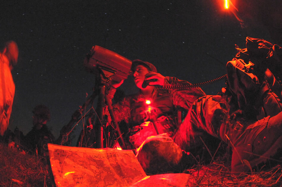 U.S. Army Pfc. Jordan Strepko brackets a call for fire mission during night indirect fire training outside Drawsko Pomorskie, Poland, on May 21, 2014. He is a forward observer from C Company, 1st Battalion, 503rd Infantry Regiment, 173rd Airborne Brigade based out of Vicenza, Italy. Paratroopers from the U.S., Poland and Canada are training together in the region to foster interoperability and demonstrate continued commitment between allies. (U.S. Army photo by Staff Sgt. Brendan Stephens, 382nd Public Affairs Detachment)