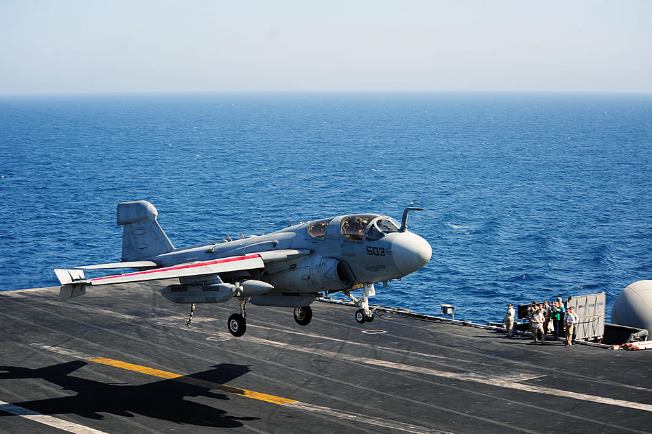 ARABIAN GULF (July 21, 2014) An EA-6B Prowler assigned to the Garudas of Electronic Attack Squadron (VAQ) 134 prepares to land on the flight deck of the aircraft carrier USS George H.W. Bush (CVN 77). George H.W. Bush is supporting maritime security operations and theater security cooperation efforts in the U.S. 5th Fleet area of responsibility. (U.S. Navy photo by Mass Communication Specialist 3rd Class Joshua Card)