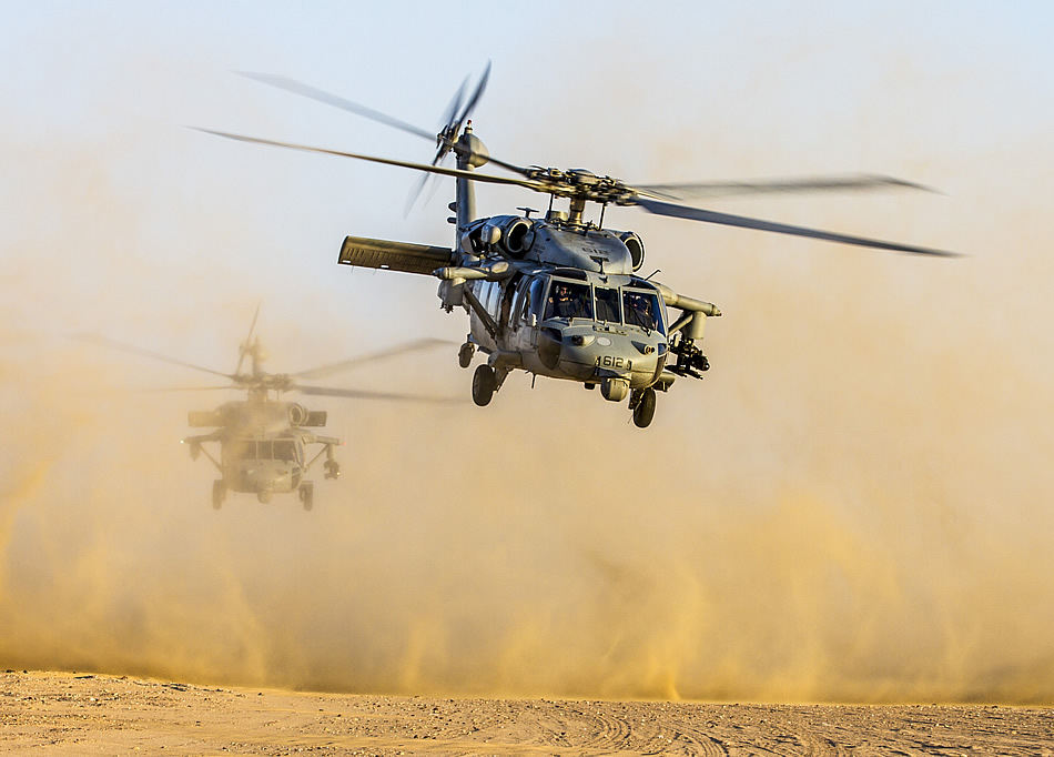 Two Navy MH-60S Sea Hawk helicopters from the aircraft carrier USS George H.W. Bush take off after switching pilots during a joint fire exercise with Army AH-64 Apaches from 3rd Battalion, 159th Attack Reconnaissance Battalion (ARB), 42nd Combat Aviation Brigade (CAB), and Air Force joint terminal attack controllers from the 82nd Expeditionary Air Operations Squadron on July 8, 2014, near Camp Buehring, Kuwait. The ARB, originally stationed in Germany under the 12th CAB, is deployed to Kuwait in support of Operation Enduring Freedom under the 42nd CAB, New York Army National Guard. (N.Y. Army National Guard photo by Sgt. Harley Jelis)