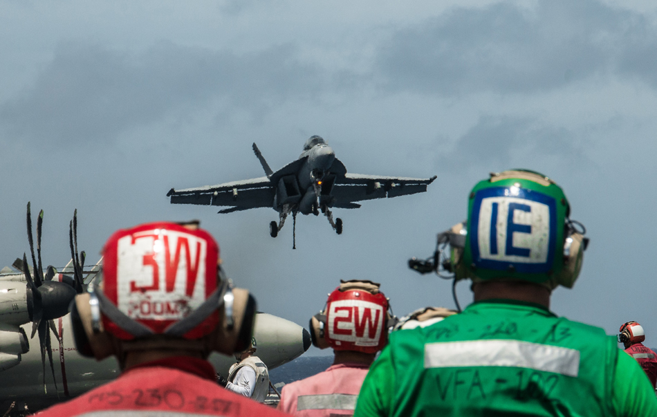 WATERS OFF THE COAST OF GUAM (Sept. 21, 2015) Sailors watch as an F/A-18F Super Hornet attached to the Diamondbacks of Strike Fighter Squadron (VFA) 102 approaches for a landing on the flight deck of the Nimitz-class aircraft carrier USS Ronald Reagan (CVN 76). Ronald Reagan and its embarked air wing, Carrier Air Wing (CVW) 5, provide a combat-ready force that protects and defends the collective maritime interests of its allies and partners in the Indo-Asia-Pacific region. (U.S. Navy photo by Mass Communication Specialist 3rd Class Nathan Burke)