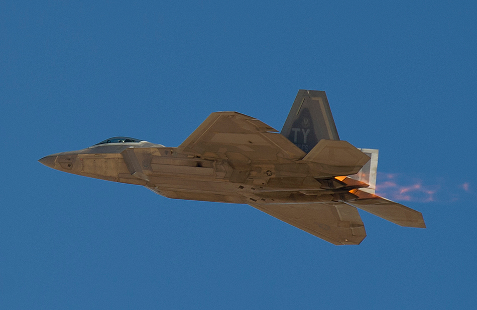 An F-22 Raptor from Tyndall Air Force Base, Fla., flies over Nellis AFB, Nev., during Red Flag 16-1, Feb. 5, 2016. Twelve Tyndall F-22s participated in Red Flag 16-1, a joint-training, full-spectrum readiness exercise designed to provide the most realistic combat training possible. (U.S. Air Force photo/Senior Airman Alex Fox Echols III)