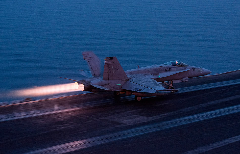 ARABIAN GULF (May 8, 2016) An F/A-18C Hornet, assigned to the "Rampagers" of Strike Fighter Squadron (VFA) 83, launches from the flight deck of aircraft carrier USS Harry S. Truman (CVN 75). Harry S. Truman Carrier Strike Group is deployed in support of Operation Inherent Resolve, maritime security operations, and theater security cooperation efforts in the U.S. 5th Fleet area of operations. (U.S. Navy photo by Mass Communication Specialist Seaman Lindsay A. Preston)