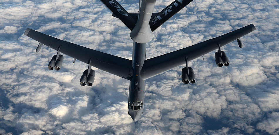 A KC-135 Stratotanker from RAF Mildenhall, England, refuels a B-52 Stratofortress from Minot Air Force Base, North Dakota, in support of Operation Polar Roar over Scotland, Aug. 1, 2016. Polar Roar is a U.S. Strategic Command operation designed to strengthen bomber crews' interoperability and demonstrate ability for the U.S. bomber force to provide flexible and vigilant long-range global-strike capability. (U.S. Air Force photo by Staff Sgt. Kate Thornton)