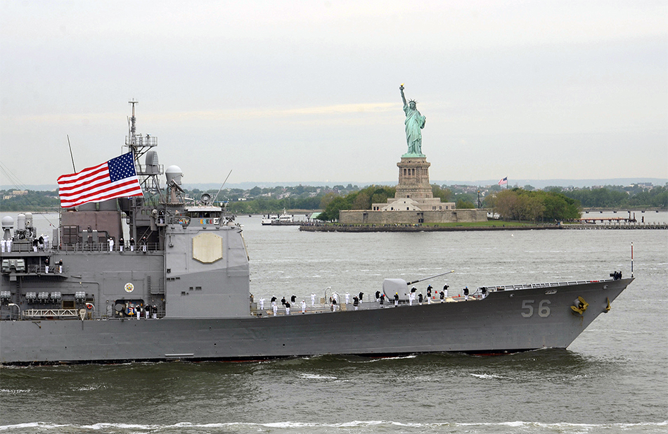 MANHATTAN, N.Y. (May 24, 2017) The guided-missile cruiser cruiser USS San Jacinto (CG 56) renders honors as it approaches the Statue of Liberty during the 29th annual Fleet Week New York's (FWNY) Parade of Ships. FWNY is an unparalleled opportunity for the citizens of New York and the surrounding tri-state area to meet Sailors, Marines and Coast Guardsmen, as well as witness firsthand the latest capabilities of today's military. (U.S. Navy photo by Chief Mass Communication Specialist Travis Simmons)
