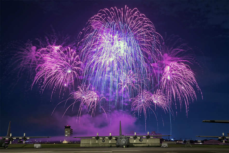 Fireworks explode behind C-130 Hercules during Celebrate America, June 30, 2017, at Yokota Air Base, Japan. Celebrate America is an annual event that provides military members and their families the opportunity to enjoy games, food and bands before culminating in a fireworks display over the Yokota AB airfield to celebrate Independence Day. (U.S. Air Force photo/Yasuo Osakabe)