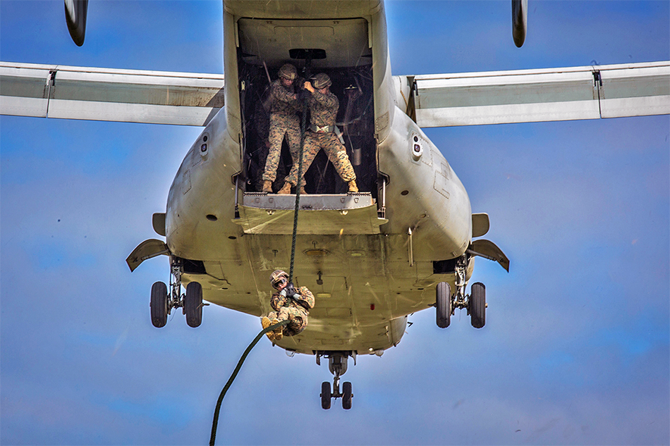A Marine descends from an MV-22B Osprey during training at Camp Hansen, Okinawa, Japan, Nov. 28, 2017. Marine Corps photo by Lance Cpl. Andy Martinez