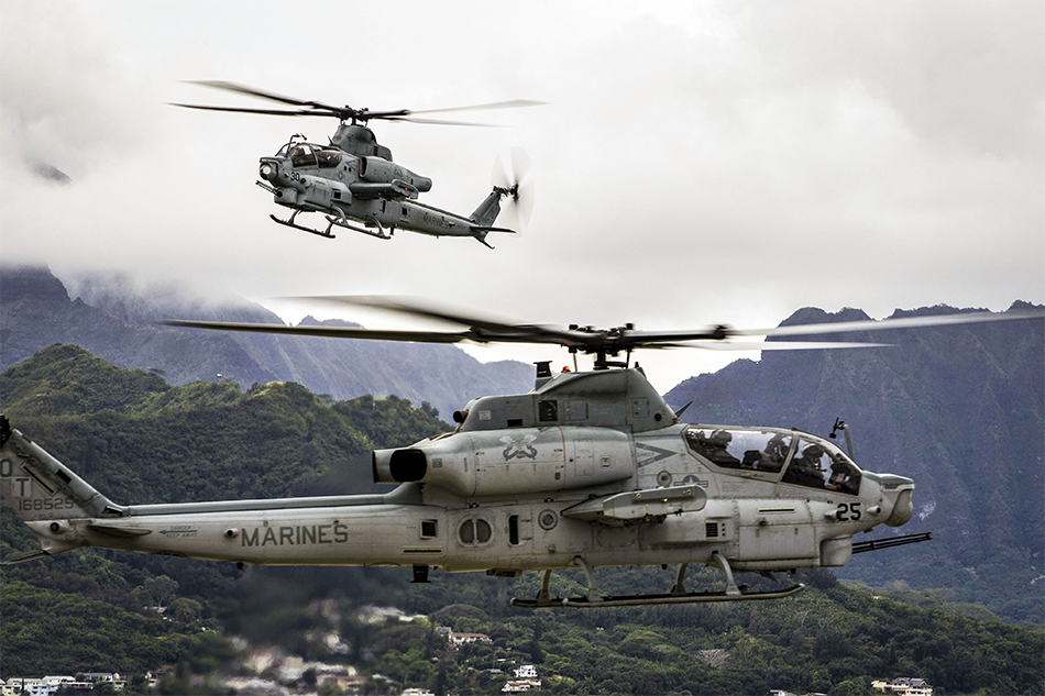 Two of Hawaii’s first three AH-1Z Vipers fly near Marine Corps Air Station, Kaneohe Bay, Dec. 19, 2017. The arrival of the 4th generation attack helicopters enhances the capabilities and power projection of Marine Light Attack Helicopter Squadron 367, Marine Aircraft Group 24, 1st Marine Aircraft Wing and Marine Corps Base Hawaii. Marine Corps Photo by Sgt. Alex Kouns