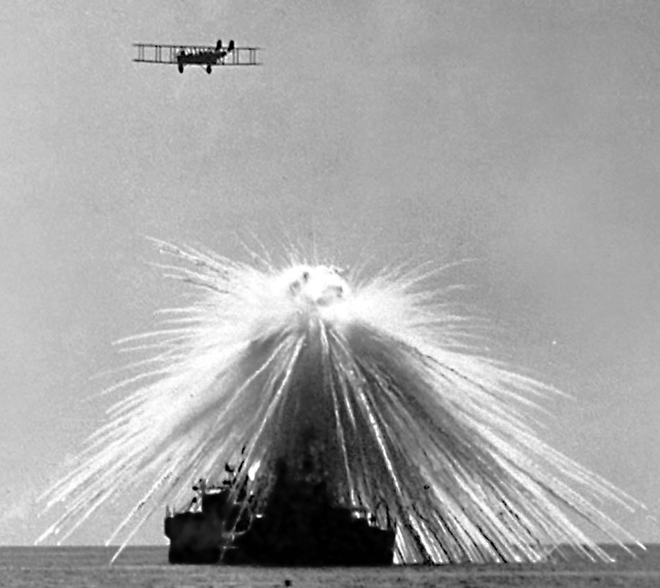 An MB-2 hits its target, the obsolete battleship USS Alabama during tests. On Sep. 27, 1921, still operating with Mitchell�s provisional air brigade, the group�s MB-2 aircraft bombed and sank the ex-U.S. Navy battleship Alabama (BB-08) in Tangier Bay, Chesapeake Bay, Md