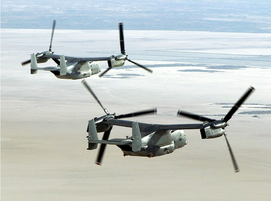 OVER EDWARDS AIR FORCE BASE, Calif. -- The first two Air Force CV-22 Osprey test aircraft fly in formation here. A third Osprey arrived at the base Feb. 26. (U.S. Air Force photo by James Haseltine)