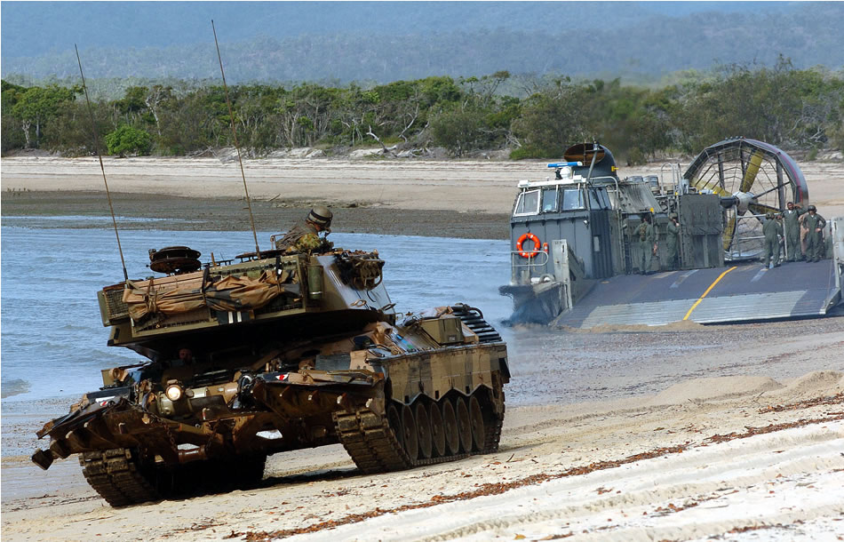 Queensland, Australia (June 19, 2005) - An Australian Army Leopard AS1 main battle tank moves up the beach at Sabina Point after being transported ashore by a U.S. Navy Landing Craft, Air Cushion (LCAC), assigned to Assault Craft Unit Five (ACU-5), during exercise Talisman Sabre 2005. Talisman Sabre is an exercise jointly sponsored by the U.S. Pacific Command and Australian Defense Force Joint Operations Command, and designed to train the U.S. Seventh Fleet commander's staff and Australian Joint Operations staff as a designated Combined Task Force (CTF) headquarters. The exercise focuses on crisis action planning and execution of contingency response operations. U.S. Pacific Command units and Australian forces will conduct land, sea and air training throughout the training area. More than 11,000 U.S. and 6,000 Australian personnel will participate. U.S. Navy photo by Photographer's Mate 1st Class David A. Levy