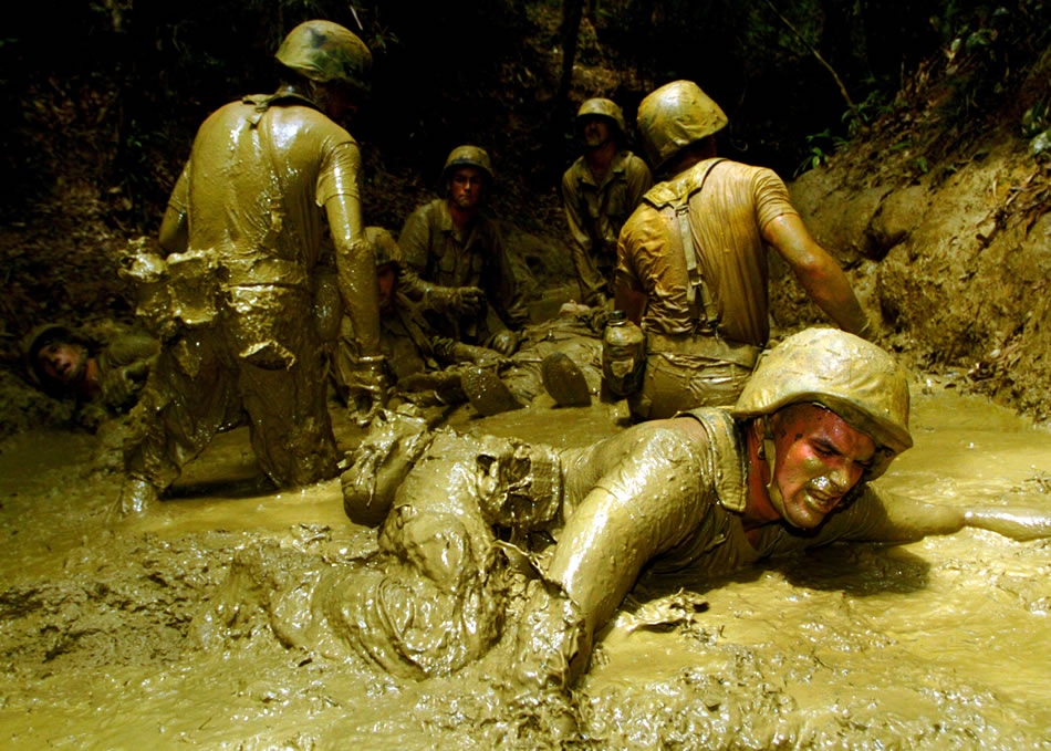 Okinawa, Japan (Aug. 17, 2005) - U.S. Navy Construction Electrician 2nd Class Ryan Gerdon struggles through what is known as "Peanut Butter Alley" during an obstacle course at the Jungle Warfare Training Center (JWTC), located in the Northern Training Area on the island of Okinawa. Petty Officer Hawkins is assigned to Naval Mobile Construction Unit Seven Four (NMCB-74). U.S. Navy photo by Photographer's Mate 2nd Class Eric S. Powel