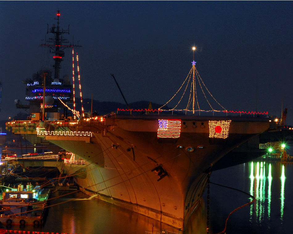 YOKOSUKA, Japan (Dec. 20, 2007) Holiday lights illuminate USS Kitty Hawk (CV 63) in celebration of the holiday season. Kitty Hawk is the world's only permanently forward-deployed aircraft carrier and operates from Fleet Activities Yokosuka. U.S. Navy photo by Mass Communication Specialist 3rd Class Bryan Reckard