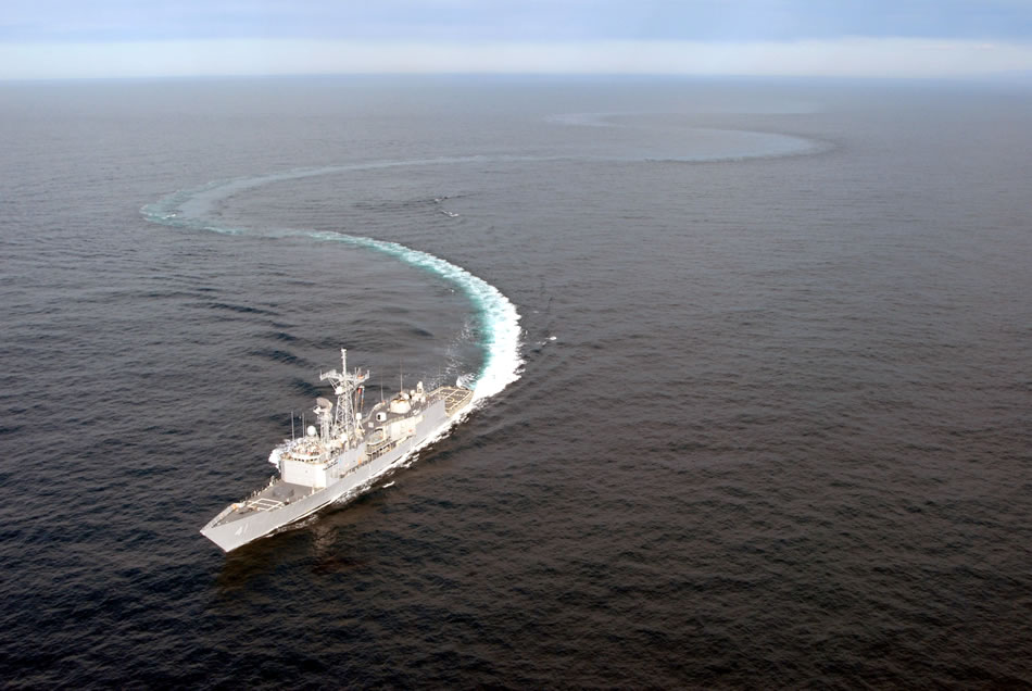 Pacific Ocean (Jan. 19, 2007) � Guided missile frigate USS McClusky (FFG 41) conducts high speed turns while hosting the Leaders to Sea program off the coast of California. Leaders to Sea is a civilian guest-embarkation program designed to give leaders of the community an opportunity to develop a deeper understanding of the Navy and its mission by boarding a naval vessel and observing daily operations at sea. U.S. Navy photo by Mass Communication Specialist Seaman Apprentice Jonathan Husman