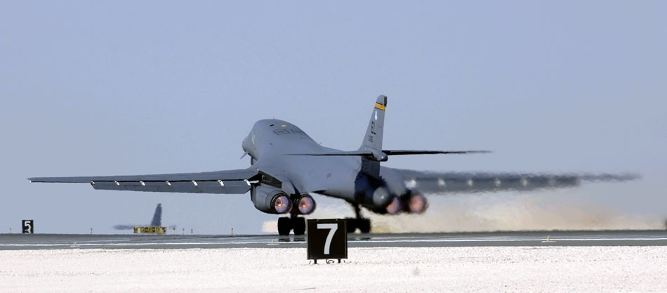 A 34th Expeditionary Bomb Squadron B-1B Lancer departs on a mission Feb. 15. The squadron is involved in a show of presence in Iraq as part of an intensified effort to complement Baghdad security plan operations. (U.S. Air Force photo/Staff Sgt. David Miller)