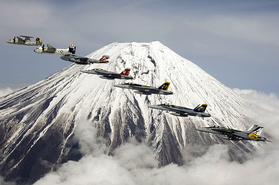 Aircraft assigned to Carrier Air Wing Five perform a formation flight in front of Mount Fuji, Japan, April 12, 2007. The wing is embarked aboard USS Kitty Hawk (CV 63), which operates from Fleet Activities Yokosuka, Japan. (U.S. Navy photo by Mass Communication Specialist 3rd Class Jarod Hodge)