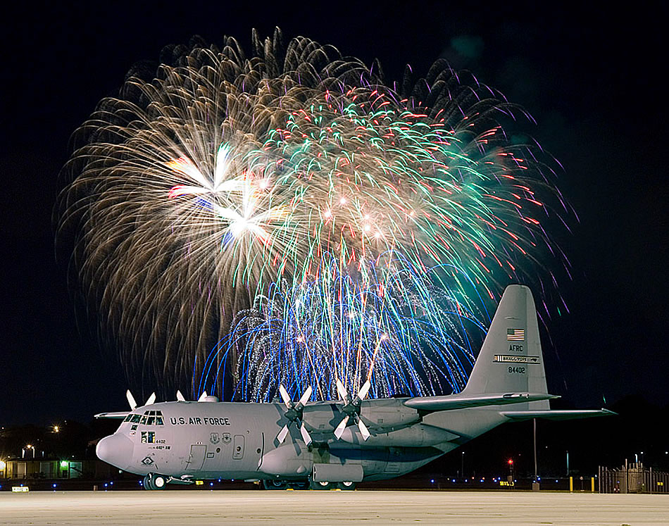 A C-130 Hercules from the Air Force Reserve Command's 440th Airlift Wing at General Mitchell Air Reserve Station, Wis., sits on the ramp during a 4th of July fireworks display taking place in a neighboring community. (U.S. Air Force photo/Joe Oliva)