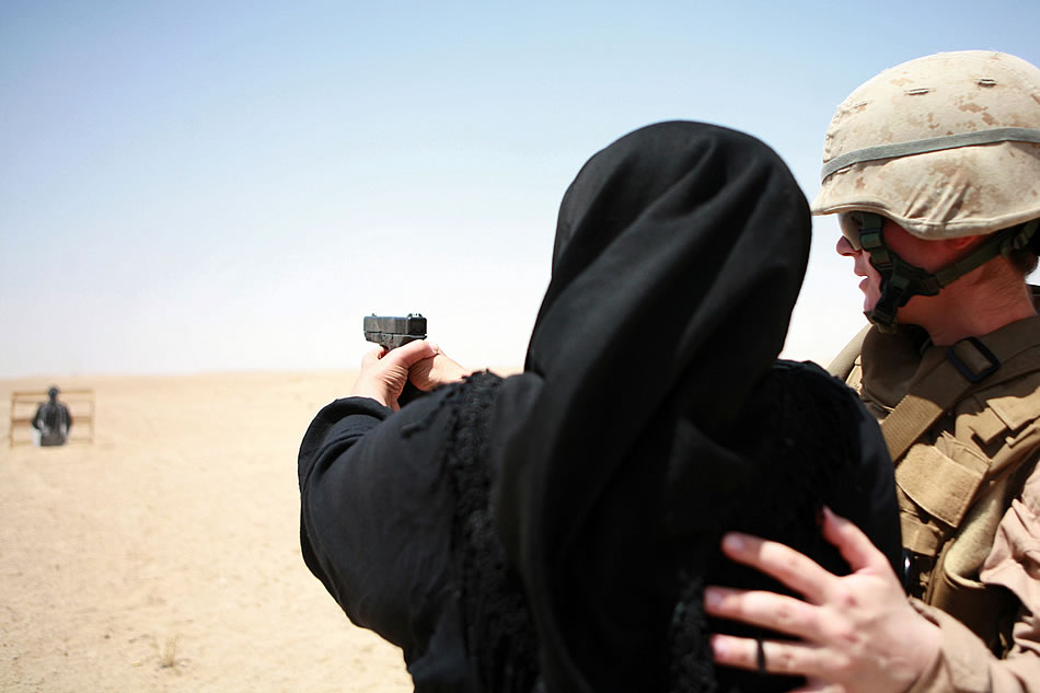 U.S. Marine 1st Lt. Kathryne B. Schilling coaches a woman as she prepares to shoot a pistol during her training to become a Sister of Ferris, June 4, 2008, Ferris, Iraq. The Sisters of Ferris will inspect women for weapons, suicide vests, large amounts of cash and contraband at entry control points. Schilling is assigned to Combat Logistics Battalion 1, 1st Marine Logistics Group. U.S. Marine Corps photo by Lance Cpl. Cindy G. Alejandrez