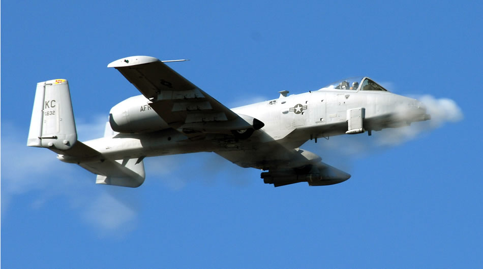 An A-10 Thunderbolt II pilot from the Air Force Reserve Command's 442nd Fighter Wing based at Whiteman Air Force Base, Mo., fires the plane's 30-mm cannon toward a target at the Smoky Hill Range near Salina, Kan., Oct. 16. Fourteen A-10 units from across the Air Force are competing in Hawgsmoke 2008, a biennial A-10 bombing and aerial gunnery competition, this year hosted by the 442nd FW. (U.S. Air Force photo/Master Sgt. Bill Huntington