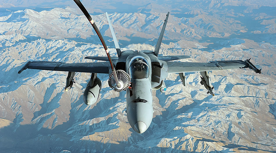 A KC-10 Extender from the 908th Expeditionary Aerial Refueling Squadron refuels a Navy F/A-18 Hornet Dec. 11 over Afghanistan. The KC-10 holds six tanks that carry more than 356,000 pounds of fuel. (U.S. Air Force photo/Staff Sgt. Aaron Allmon)