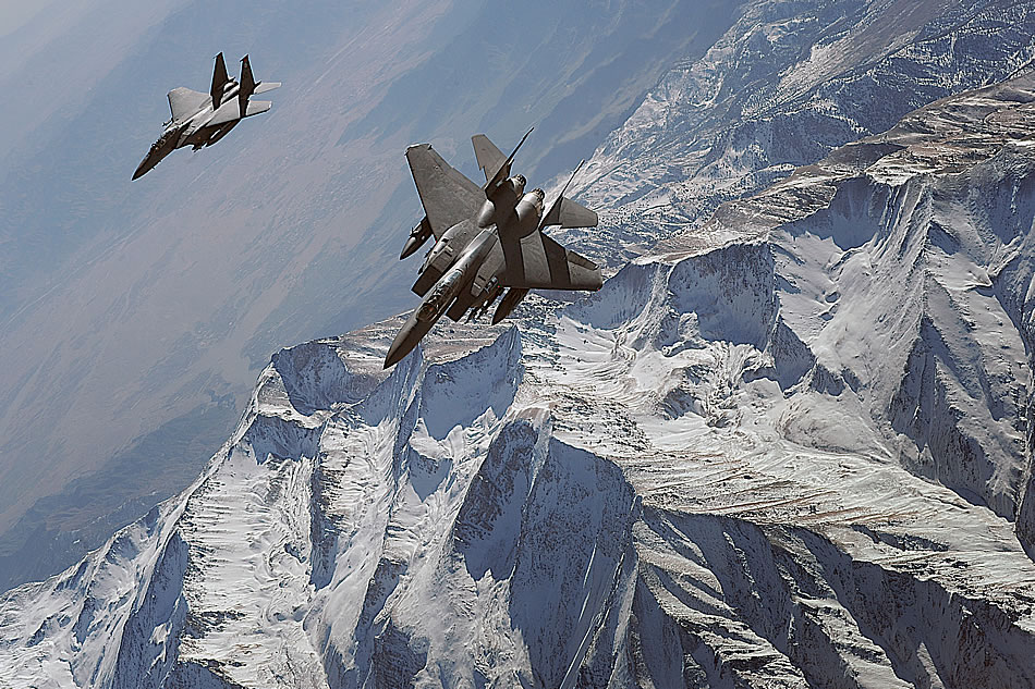 Two U.S. Air Force F-15E Strike Eagle aircraft conduct a combat patrol over Afghanistan Dec. 11, 2008. The air crews and planes are assigned to the 391st Expeditionary Fighter Squadron, Bagram Air Base, Afghanistan. U.S. Air Force photo by Staff Sgt. Aaron Allmon
