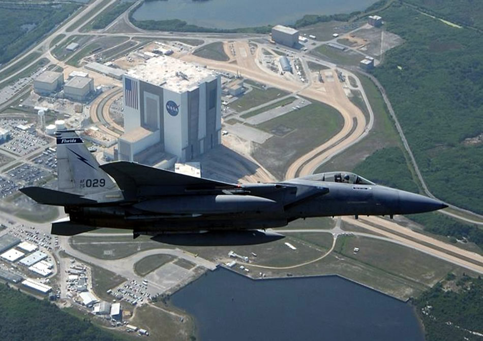 An F-15 Eagle flies over NASA's Cape Canaveral. NORAD and NORTHCOM routinely provide military support to NASA shuttle launches, ensuring airspace safety and security for the launch and landing by enforcing the FAA's Temporary Flight Restriction zones. NORTHCOM is responsible for an area of operations that includes the United States, Canada and Mexico. The command serves as a "one-stop-shopping" point for military support in case of an attack on American soil.