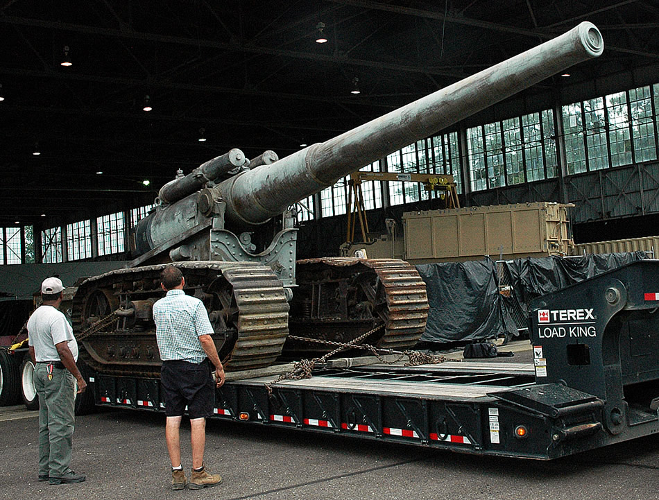 Transportation personnel at Naval Support Facility Dahlgren prepare to off-load a World War I-era tractor-mounted artillery piece, the first gun originally test fired to mark the establishment of Dahlgren as a naval proving ground on Oct. 16, 1918. The 7-inch, 45-caliber gun will be restored by the Naval Surface Warfare Center Dahlgren Division.