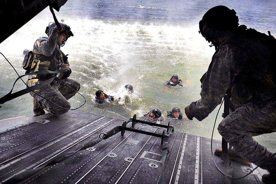 U.S. Army soldiers use a rope ladder to board a CH-47 Chinook helicopter during a month-long joint operations and tactics course in the Gulf of Mexico, Aug. 5, 2009. The CH-47 crew is assigned to Task Force 160th Special Operations Aviation Regiment, Fort Bragg, N.C. U.S. Air Force photo by Senior Airman Julianne Showalter