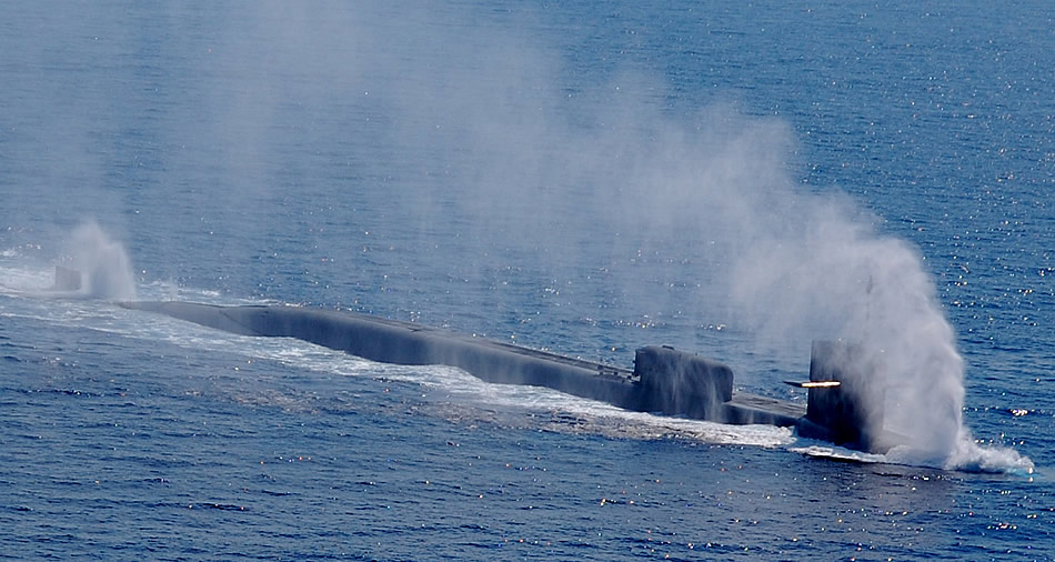 The Ohio-class guided-missile submarine USS Georgia begins to submerge after a port visit to Naples, Italy. Georgia, home ported at Naval Submarine Base Kings Bay, Ga., is on her maiden operational SSGN deployment since converting from a ballistic missile submarine to a guided-missile submarine. Photo by William Parker