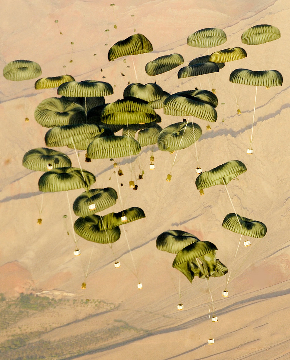 Pallets of cargo drop from a C-17 Globemaster III to a forward operating base in Afghanistan, Aug. 27, 2009, in support of Operation Enduring Freedom. The aircraft is assigned to the 817th Expeditionary Airlift Squadron. (U.S. Air Force photo/Staff Sgt. Michael B. Keller)