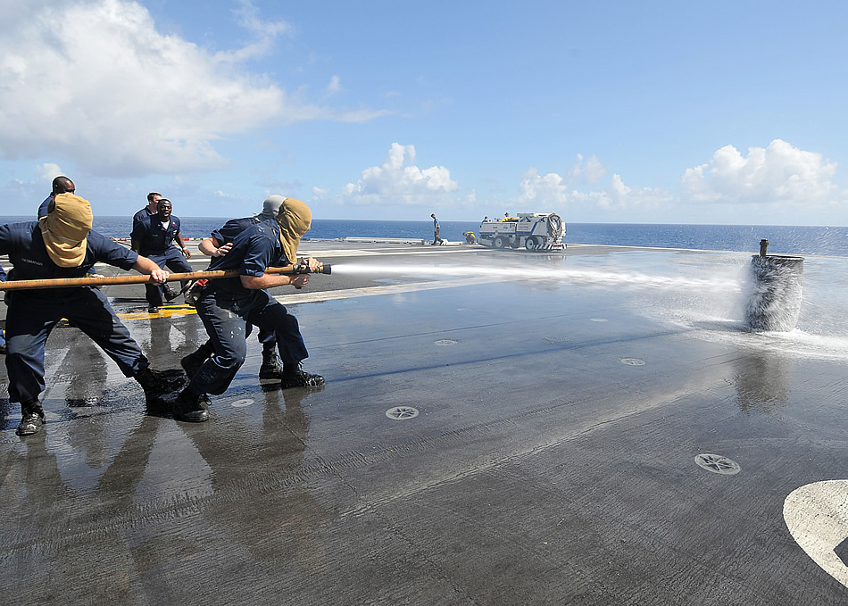 090902-N-6233H-026 PACIFIC OCEAN (Sept. 2, 2009) Sailors try to push a barrel across the flight deck with a fire hose during the damage control Olympics aboard the aircraft carrier USS George Washington (CVN 73). George Washington, the Navy's only permanently forward-deployed aircraft carrier, is completing her inaugural summer deployment supporting security and stability in the western Pacific ocean. (U.S. Navy photo by Mass Communication Specialist Seaman Apprentice Rachel N. Hatch)
