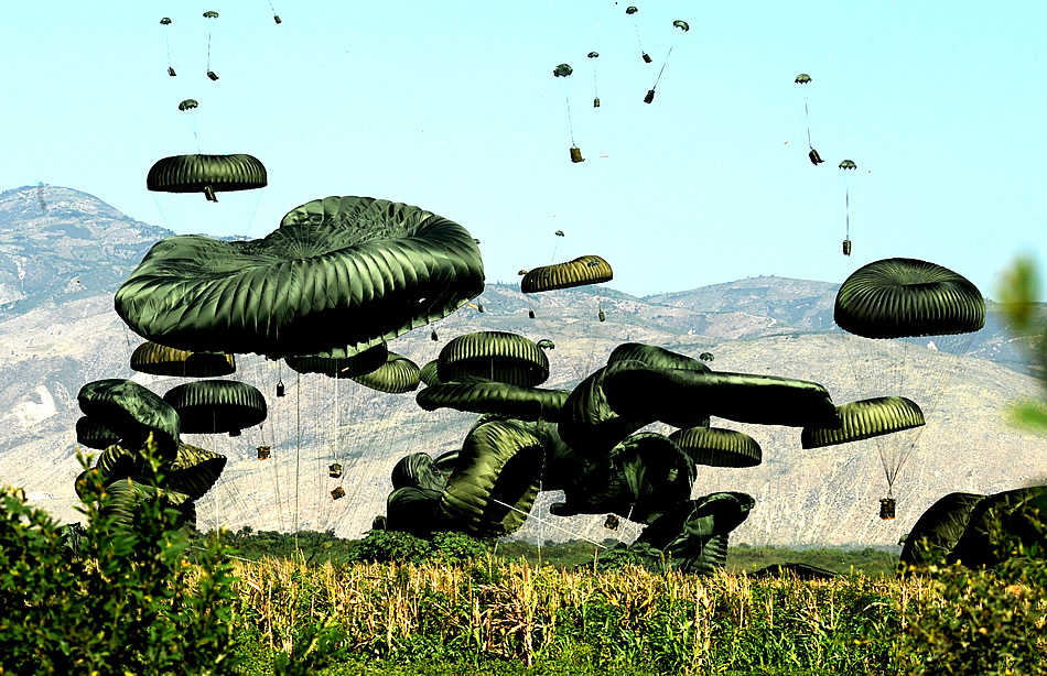 Bundles of food and water are air delivered Jan. 23, 2010, to the outlying area of Port-au-Prince, Haiti. Approximately 14,000 bottles of water and 14,500 Meals, Ready to Eat were included in the air delivery. (U.S. Air Force photo/Tech. Sgt. James L. Harper Jr.)