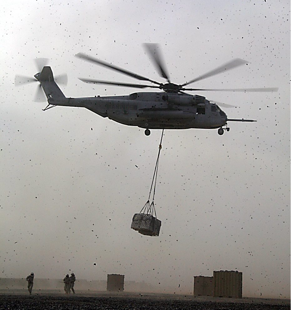 A CH-53E 'Super Stallion' helicopter from Marine Heavy Helicopter Squadron 466, Marine Aircraft Group 40, Marine Expeditionary Brigade-Afghanistan, lifts off with more than 9,000 pounds of water hanging externally from the aircraft for delivery to Marines in outlying operating bases, Jan. 29. In a matter of a few hours with just two CH-53E aircraft, the squadron transported more than 58,000 pounds of water externally. Photo by Staff Sgt. Roman Yurek