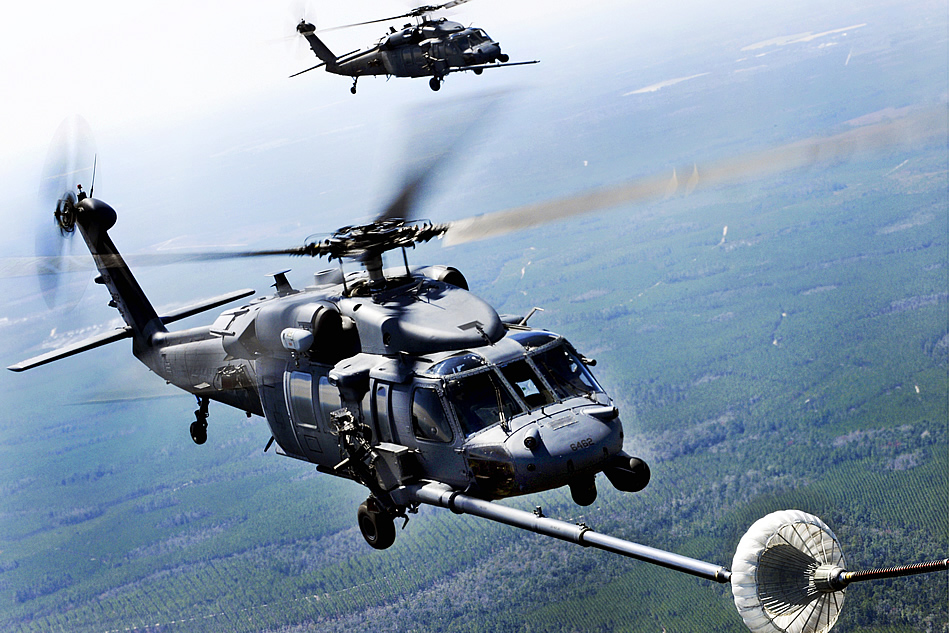 The first of two HH-60G Pave Hawk helicopters prepares to refuel near Moody Air Force Base, Ga., March 16, 2010. The helicopter crews are assigned to the 41st Rescue Squadron. A HC-130P/N Combat King from the 71st Rescue Squadron refueled the helicopters during a training mission. U.S. Air Force photo by Airman 1st Class Benjamin Wiseman