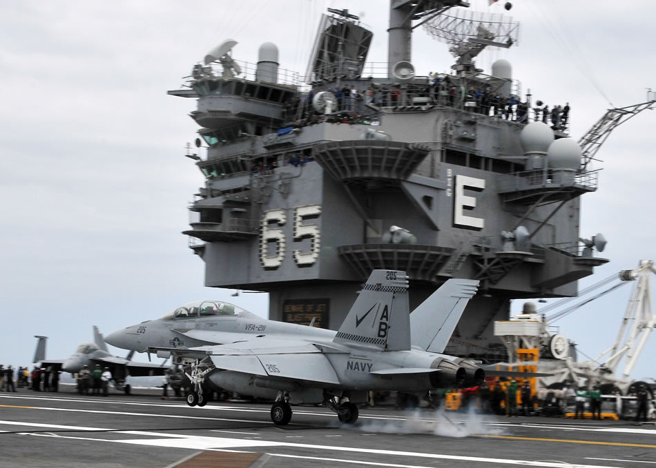 An F/A-18F Super Hornet assigned to the Checkmates of Strike Fighter Squadron 211 lands aboard the aircraft carrier USS Enterprise as part of the first squadron to land aboard the ship in more than two years. Enterprise is conducting flight deck certification leading to its 21st deployment. (Photo by: Petty Officer 2nd Class Travis S. Alston)